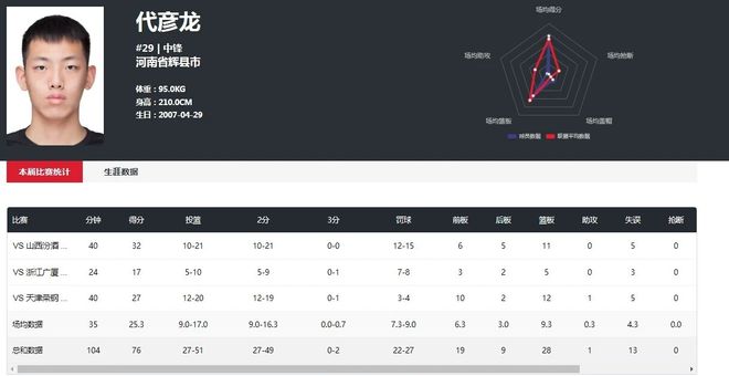 代彦龙是出生于2007年的球员,有着2米10的身高,是辽宁男篮青年队的重点培养目标。在这届U19男篮比赛中,代彦龙代表球队出战了三场比赛,场均能够得到25.3分9.3个篮板的数据,两项数据都是全队最高:对阵山西汾酒的比赛,代彦龙得到了32分11个篮板;对阵浙江广厦,代彦龙得到了17分5个篮板;对阵天津荣刚的比赛,代彦龙得到了27分12个篮板。